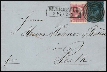 2 Sgr. schw./blau, aufgrund der Qualität offensichtlich "wiedergefundene" sog. "Portemonnaie-Marke", diese vorschriftsgemäß noch mit NS "373" entwertet trotz Einzugs der Nummernstempel zum 31.3.1859, in Mischfrankatur mit 1 Sgr. karmin, Gittergrund, diese mit Ra2 "Elberfeld", auf Brief vom 8.4.1859 nach Pesth/Ungarn. Seltene Stempel-Kombination