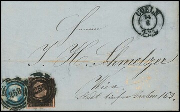 1 Sgr. schw./rosa, angeschnittenes Exemplar in seltener Mischfrankatur mit nächste Ausgabe 2 Sgr. blau auf etwas fleckigem Postvereinsbrief mit NS "258" und K2 "Coeln" nach Wien, sign. Flemming