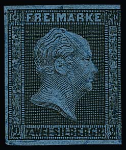 2 Sgr. schw./blau, der amtliche Neudruck von 1864 gebraucht mit zartem blauem K2, wahrscheinlich von Berlin, nur wenige Exemplare bekannt, Mi. "-.-", ex Gunn, sign. Drahn, Kruschel