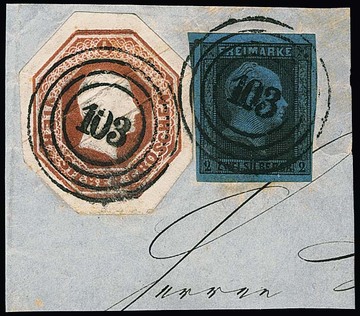 2 Sgr. schw./blau, gut geschnitten, nebst sehr breitrandig achteckig geschnittenem Oktogon-Ganzsachen-Ausschnitt 4 Sgr. rotbraun, auf Prachtbriefstück (in der Durchsicht leicht getönt) mit NS "103", sign. Banker, Grobe. Mi. 500,- ++