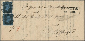 2 Sgr. schw./blau per zwei auf Kabinett-Post-Ins.-Doc. mit klaren NS "747" und Neben-L2 "Konitz" vom 17. Nov. 1850, seltener früher Brief vom dritten Markentag, sign. Brettl, ex Slg. Erivan Haub
