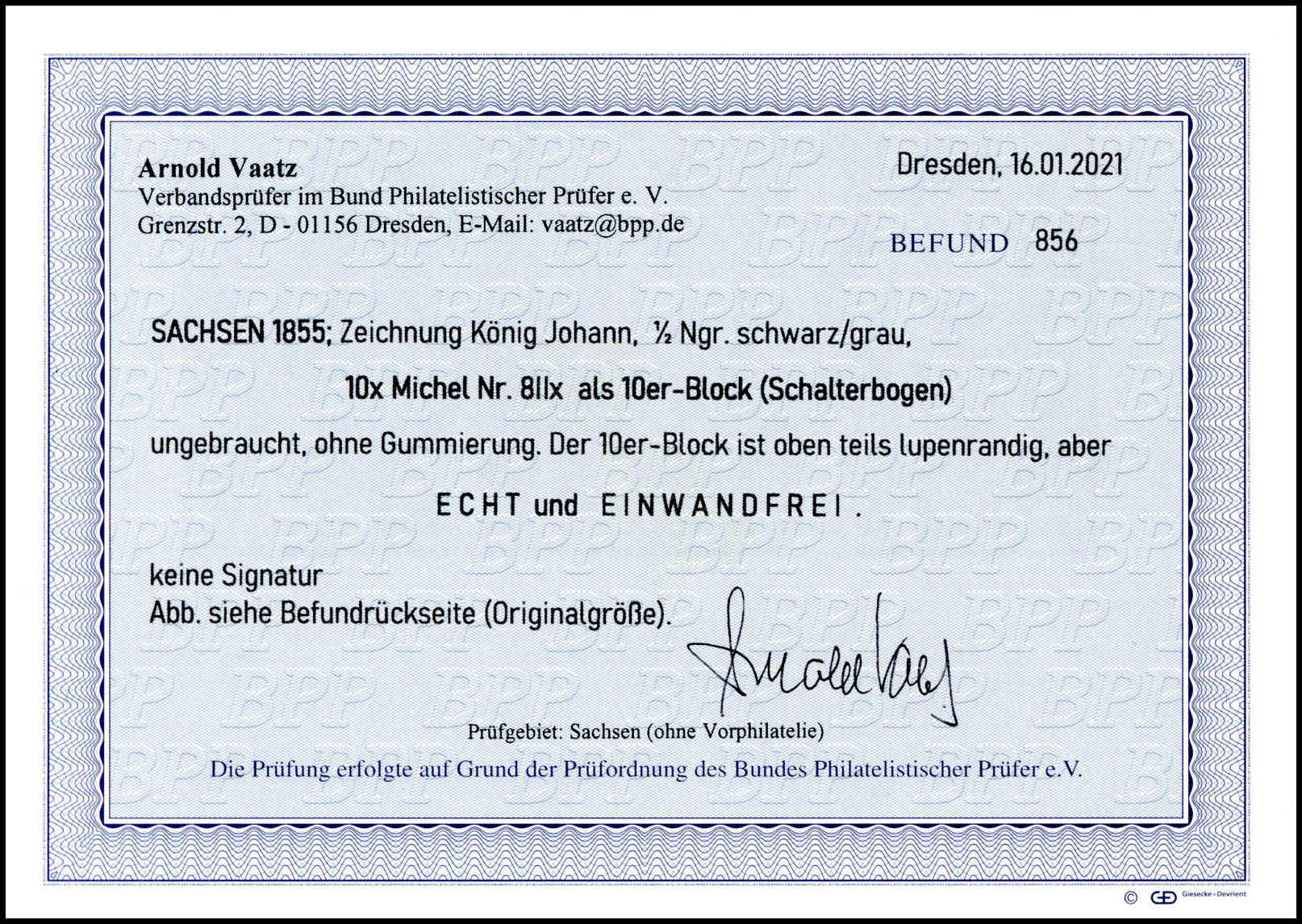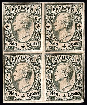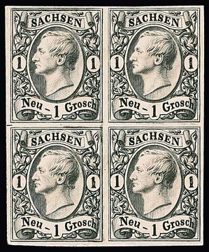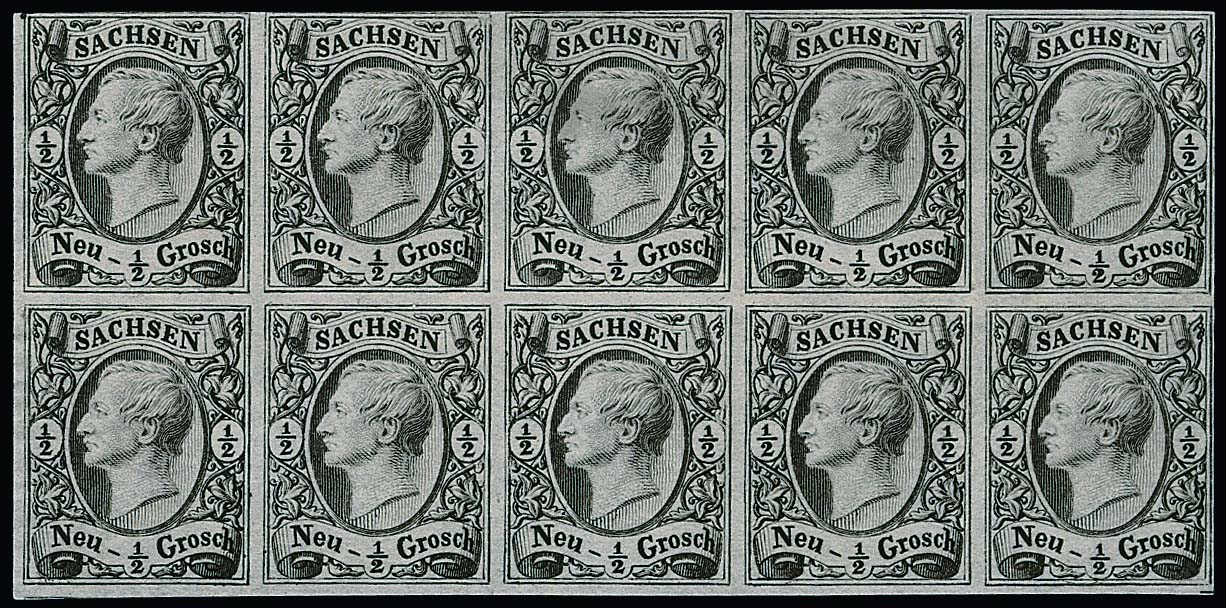 1/2 Ngr. schw./grau, Abart "gemaschtes Papier", vollständiger Originalbogen zu 10 Marken, voll- bis breitrandig geschnitten, ungebraucht o.G. in tadelloser Erhaltung. Wahrscheinlich der einzige existierende Originalbogen dieser Marke auf dem gemaschten Papier. Eine Sachsen-Rarität, Fotoexp. Vaatz