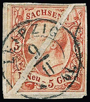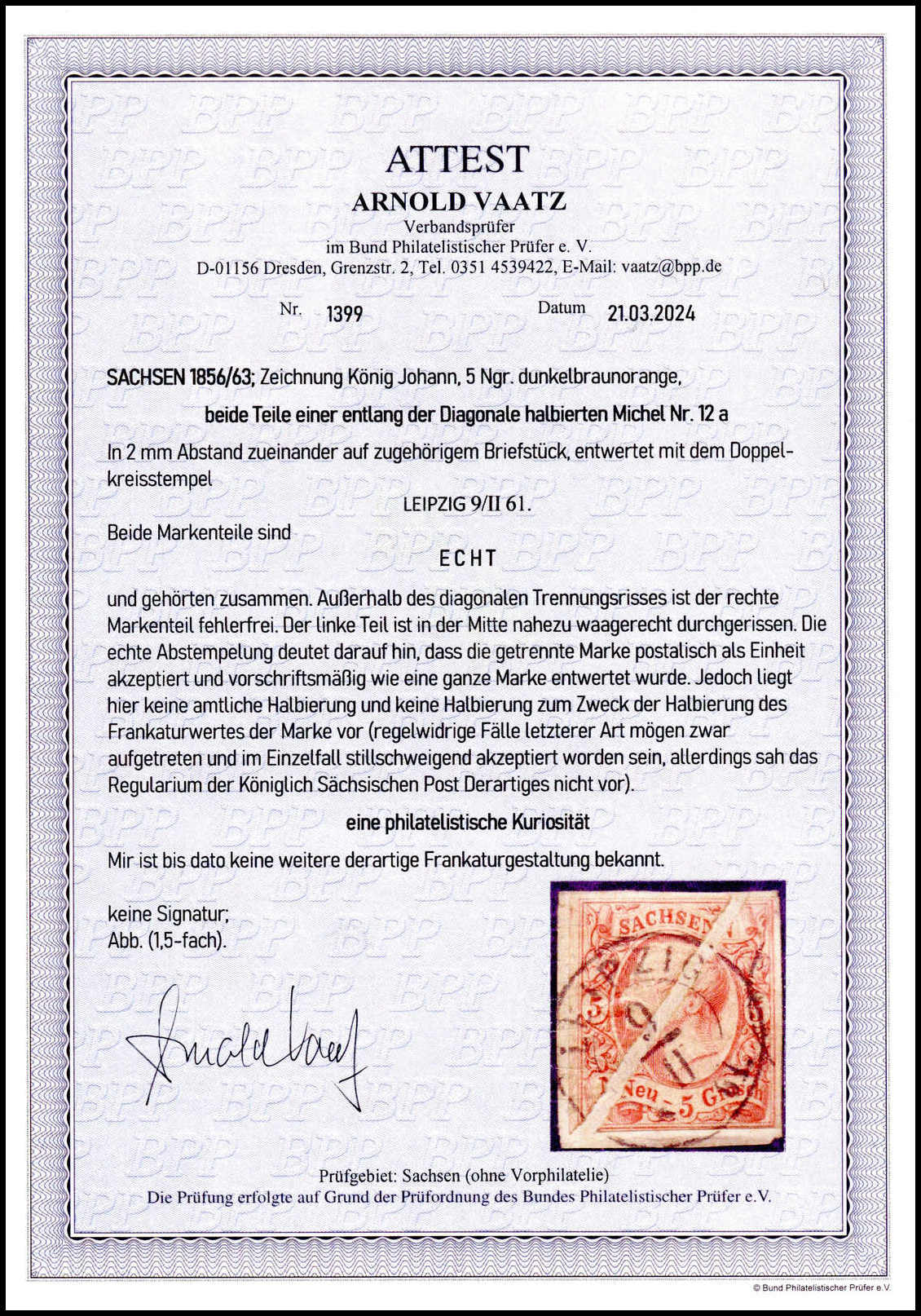 5 Ngr. ziegelrot, linke obere und rechte untere Markenhälfte mit Abstand auf Briefstück geklebt und mit klar aufges. K2 "Leipzig 9/II 61" entwertet. Die beiden Markenteile gehörten ursprünglich zusammen und sind so verwendet worden, wobei die linke obere Hälfte waager. eingerissen ist. Das ganze "Provisorium" ist offensichtlich als Einheit akzeptiert und entwertet worden. Einzelne Halbierungen der 5-Ngr.-Marke sind bisher nicht bekannt. Ein einmaliges Kuriosum, Fotoattest Vaatz ("Mir ist bis dato keine weitere derartige Frankaturgestaltung bekannt, eine philatelistische Kuriosität.")