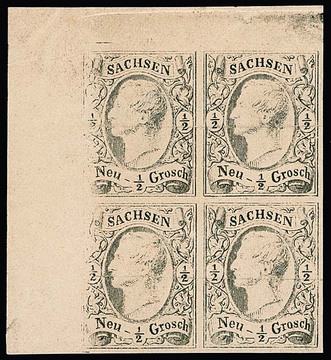 1/2 Ngr. schwarz auf beigem, dickerem Papier, Revisionsabzug im Viererblock aus der linken oberen Bogenecke mit breiten Rändern