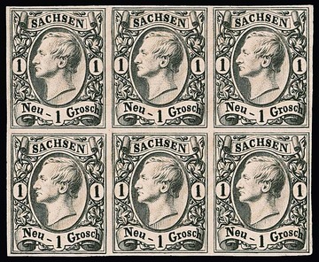 1 Ngr. schwarz auf Kartonpapier, seltener Probedruck-Sechserblock