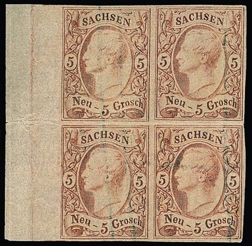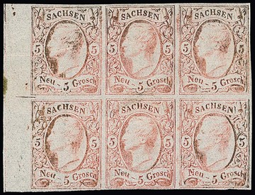5 Ngr. ziegelrot im ungebrauchten Sechserblock mit breitem linkem Bogenrand, unklarer Makulaturdruck der Druckerei Meinhold, linke obere Marke kleines Fältchen