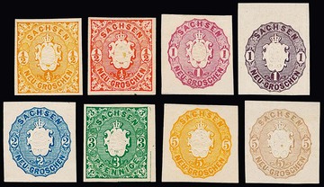 3 Pfge. grün, 1/2 Ngr. rotorange und ockergelb, 1 Ngr. rosa und rot, 2 Ngr. blau, sowie 5 Ngr. graulila und ockergelb, gesamt acht verschiedene geschnittene Probedrucke