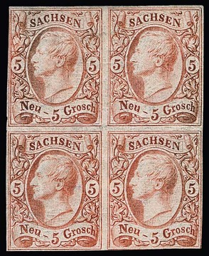 5 Ngr. bräunlichrot, ungebrauchter Viererblock mit Originalgummi (eine Marke hell, eine etwas berührt), Marken leicht verfärbt, deshalb Farbzuordnung nicht möglich, entspr. Notiz Vaatz