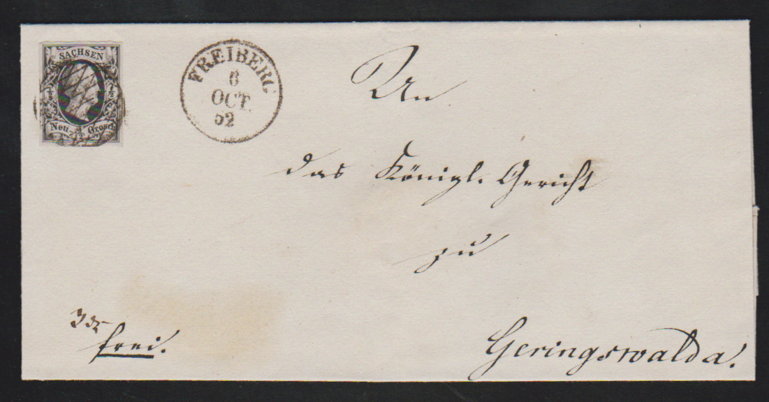 1/2 Ngr. schw./grau, Kabinettstück mit zentr. VG und Neben-K1 "Freiberg" 1852 auf Faltbrief