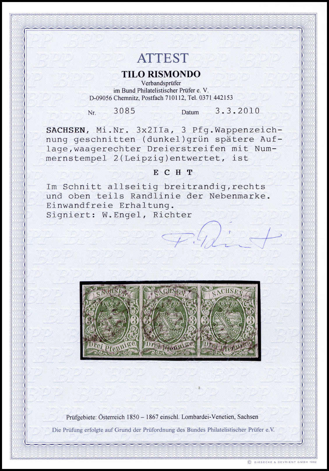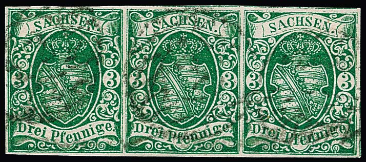 3 Pfge. dunkelgrün, breitrandiger waager. Kabinett-Dreierstreifen, NS "2" (Leipzig), Fotoattest Rismondo. Mi. 1000,- +