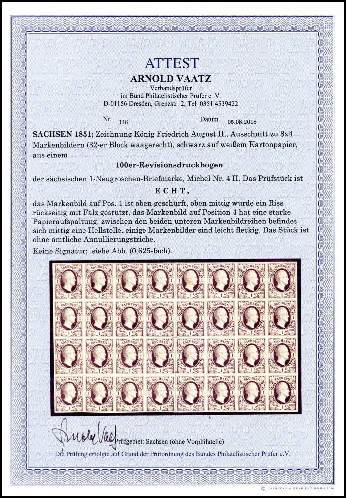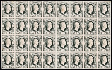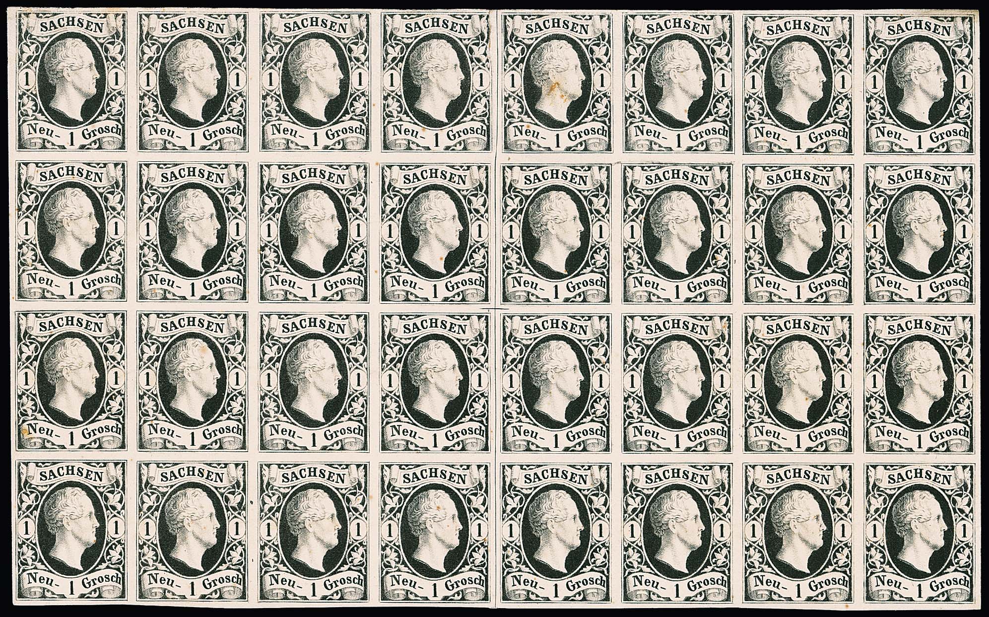 1 Ngr. schwarz im waagerechten 32er-Block aus dem Revisions-Druckbogen auf weißem Kartonpapier, breitrandig (einige wenige Werte kl. Beanstandungen). Eine ebenso dekorative wie seltene Einheit, Fotoattest Vaatz