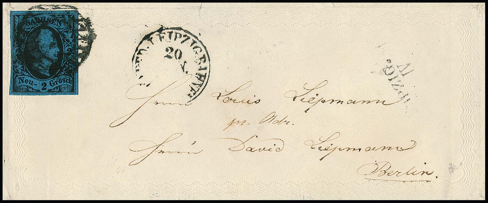 2 Ngr. schw./dunkelblau, Kabinettstück auf kleinem weißem Präge-Zierbrief von Leipzig-Bahnhof nach Berlin. Als Zierbrief der Ausgabe Friedrich-August selten