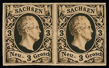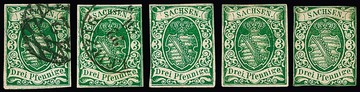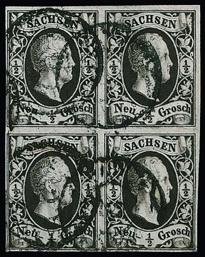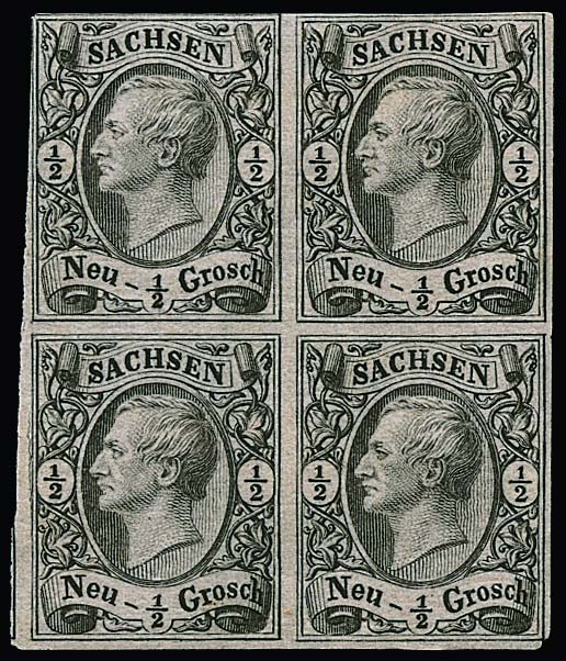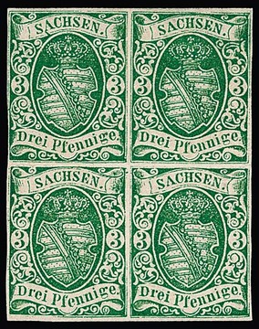 3 Pfge. dunkelgrün, spätere Auflage, frischer ungebrauchter Viererblock mit Originalgummi, Vorfaltspuren im Zwischenraum und links minimal berührt. Seltene Einheit. Mi. 2200,- plus Aufschlag für Blockeinheit, sign. Bühler, Richter, Engel mit Attest, sowie Fotoexp. Rismondo. Linke obere Marke plattenfehlerähnliche Besonderheit "Strich am A von SACHSEN" (siehe Michel-Spezial)
