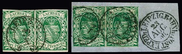 3 Pfge. saftig-, bläulich- und hellgrün, spätere Auflagen, vier gestempelte Paare (teils üblicher Schnitt, einmal Bug, einmal Faltung im Zwischenraum) in sämtlich unterschiedlichen Nuancen. Mi. mindestens 1350,-