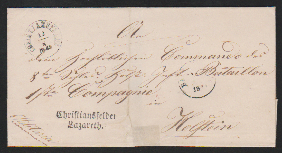 "Christiansfeld", 1849, K1 und seltener Fraktur-L2 "Christiansfelder Lazareth" auf Brief (unten Einriß gestützt) mit militärischer Adresse