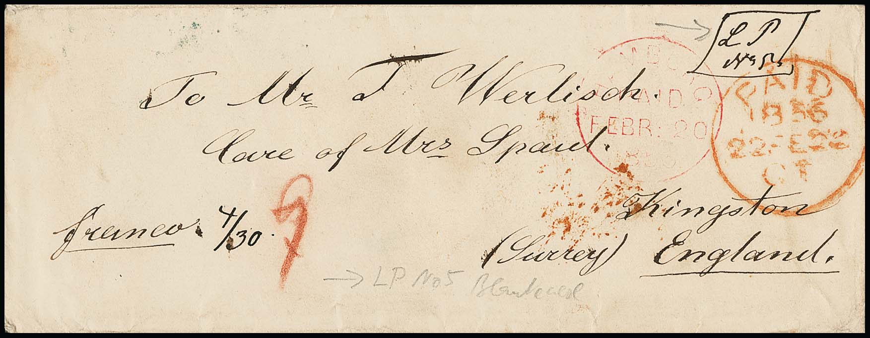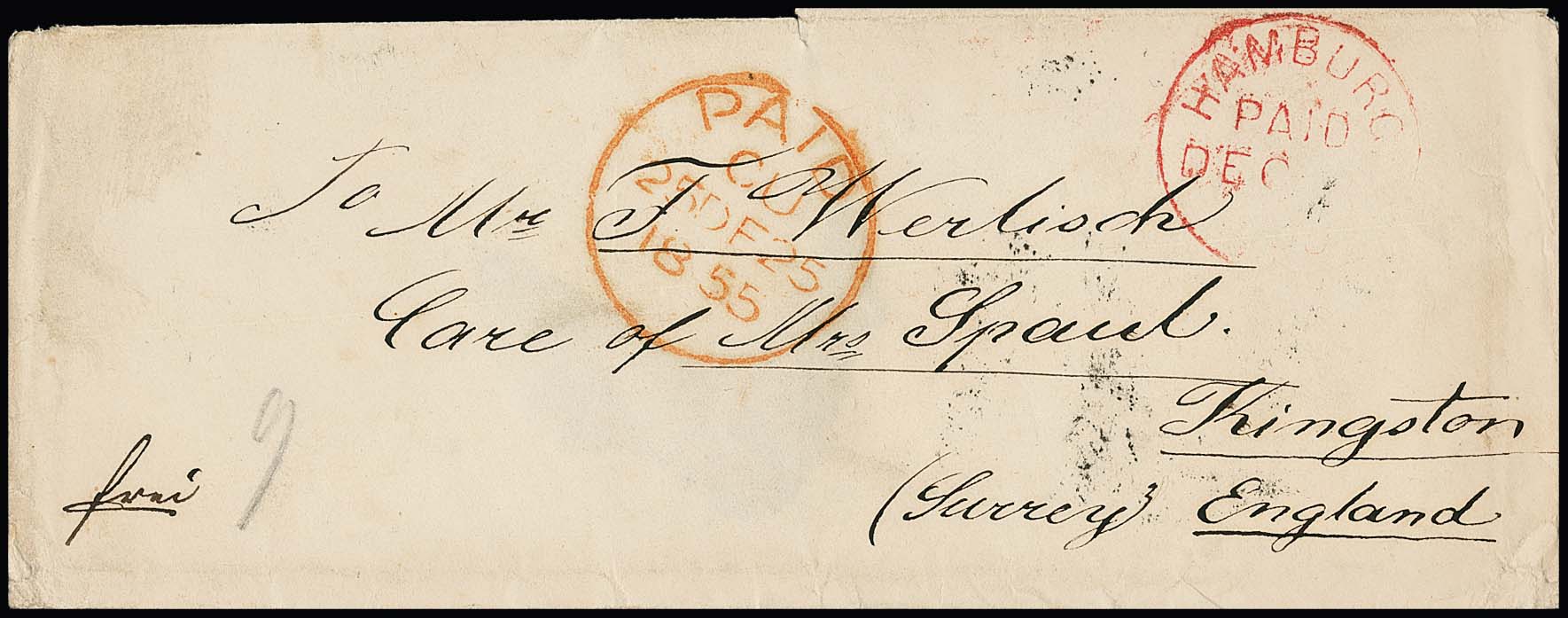 "Blankenese", 1855/56, zwei Damencouverts (typische Gebrauchsspuren) aus gleicher Korrespondenz je mit violettrotem K1 "Hamburg Paid" nach England, einmal seltenes handschriftliches Landpost-Provisorium "L.P. No. 5"