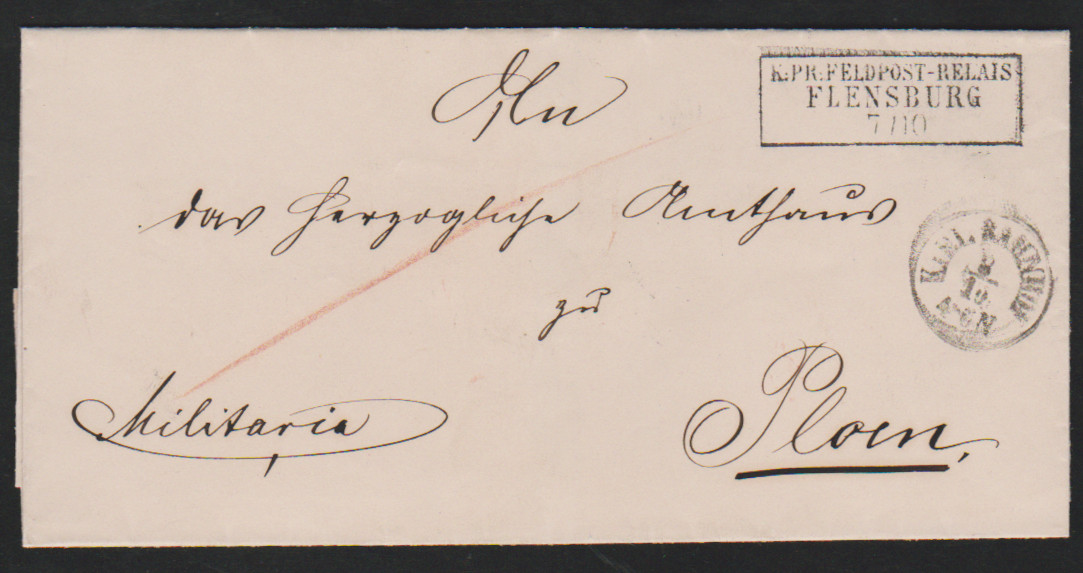 "Flensburg", (1866), seltener Feldpost-Ra3 "K. Pr. Feldpost-Relais Flensburg" (nebst K1 "Kiel Bahnhof") auf Brief nach Ploen mit rs. Feldpost-K2