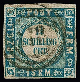 1 1/4 Sch. hellblau, weit gewellter Grund, farbfrisches und vollrandig geschnittenes, gestempeltes Exemplar, kleine randhelle Stelle. Mi. 3500,-