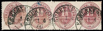 1 1/3 Sch. rosalila, seltener waagerechter Viererstreifen mit K2 "Eckernförde", die beiden linken Marken leichte vs. Tintenspuren (etwas abgenutzt), Fotoexp. Möller. Mi. "-.-"