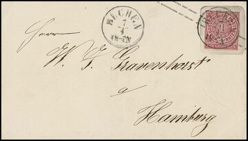 1 1/3 Sch. rotkarmin im senkrechten Paar, nebst 4 Sch. braunocker, als seltene 6 2/3 Sch.- bzw. 5 Sgr.-Frankatur auf Brief nach England, K2 "Altona 25/5 67", Umschlag stärkere Beförderungsspuren. Interessanter und seltener Auslandsbrief