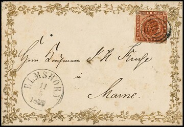 "114" nebst K1 "Elmshorn" klar auf goldbedrucktem Biedermeier-Zierbrief mit perfekter Dänemark 4 Sk. braun. Mit vorder- und rückseitig reichhaltigem grold-bronzenem Randdruck von Blumen-Ranken. Diese Art der gedruckten Zierbriefe ist von Schleswig-Holstein selten! Attest Möller