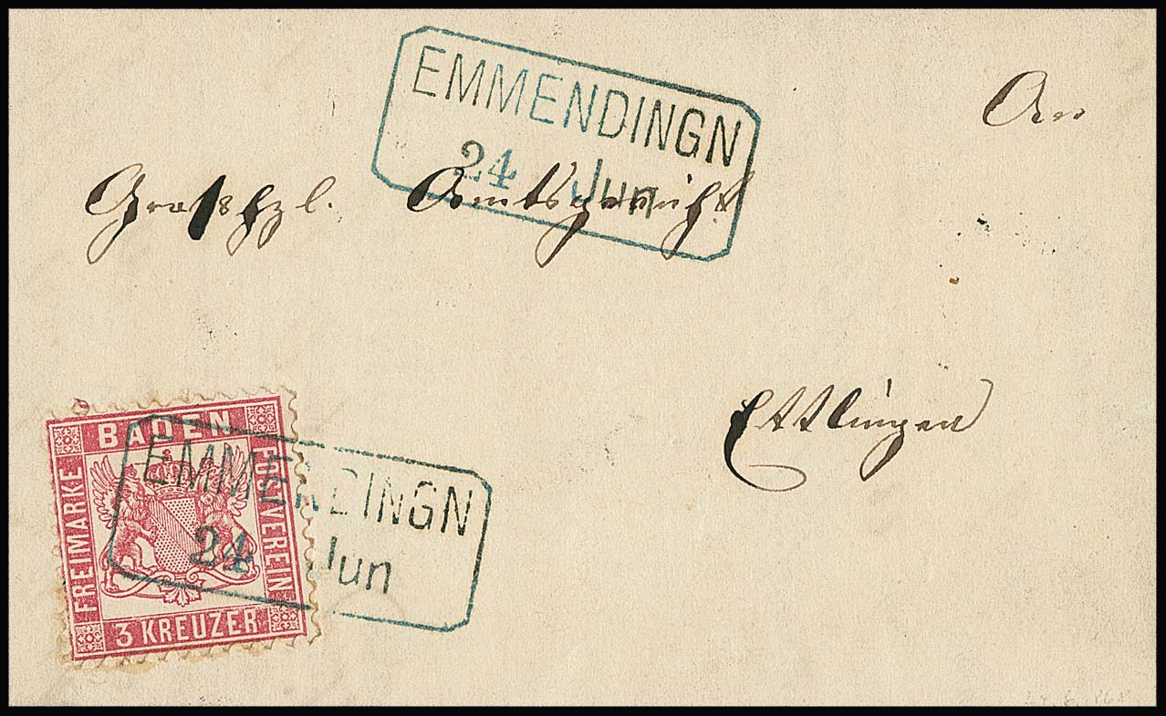 3 Kr. rosa auf Kabinettbriefchen (innen Vordruck "besonderer Zustellungsschein") 1868 mit blauem Billet-Ra2 "Emmendingen", ex Slg. Erivan Haub