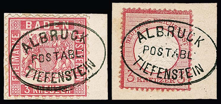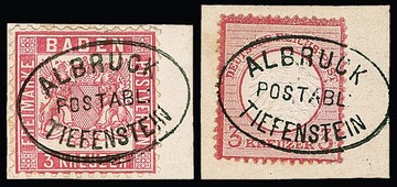 3 Kr. rosa auf Luxusbriefstück mit idealem Postablage-Ovalstempel "Albruck-Tiefenstein", ferner gleicher Stempel auf weiterem Briefstück, Paar 1 Kr. grün (ein Zahn) sowie nachverwendet auf Briefstück 3 Kr. kl. Brustschild, ex Slg. Erivan Haub