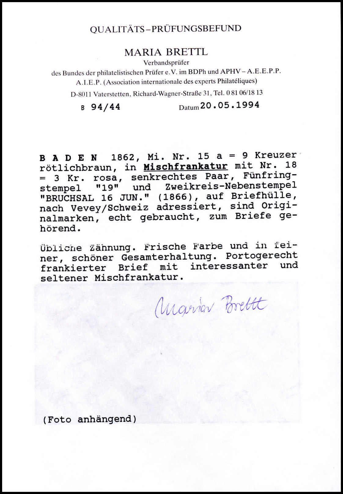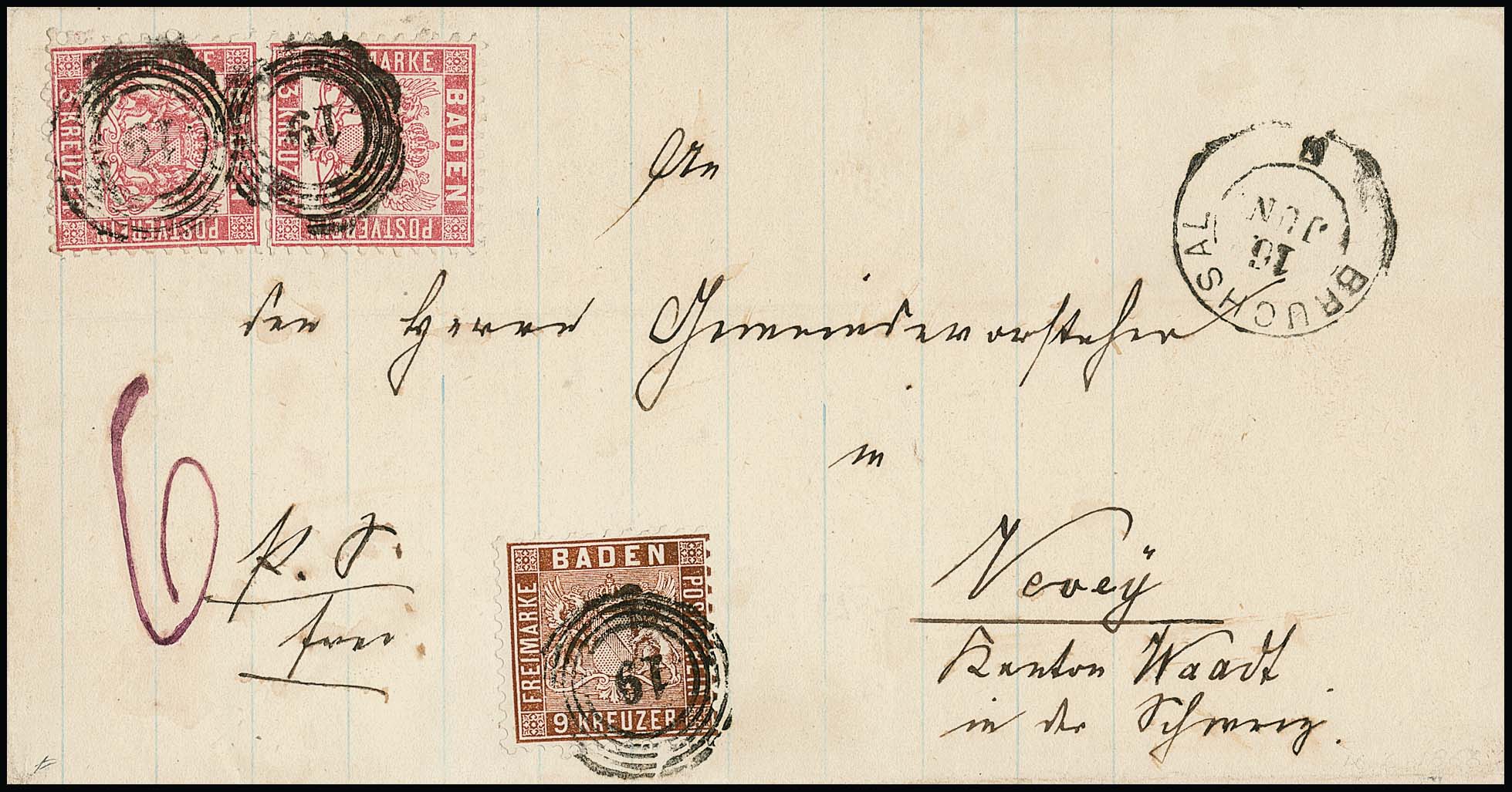 9 Kr. braun in Mischfrankatur mit zweimal 3 Kr. rosa auf aktenfrischem Kabinettbrief nach Vevey/Schweiz, NS "19" und Aufgabe-K2 "Bruchsal 19/2 (1866)". Seltene Frankatur-Kombination in sehr schöner Erhaltung, Fotoattest Brettl