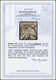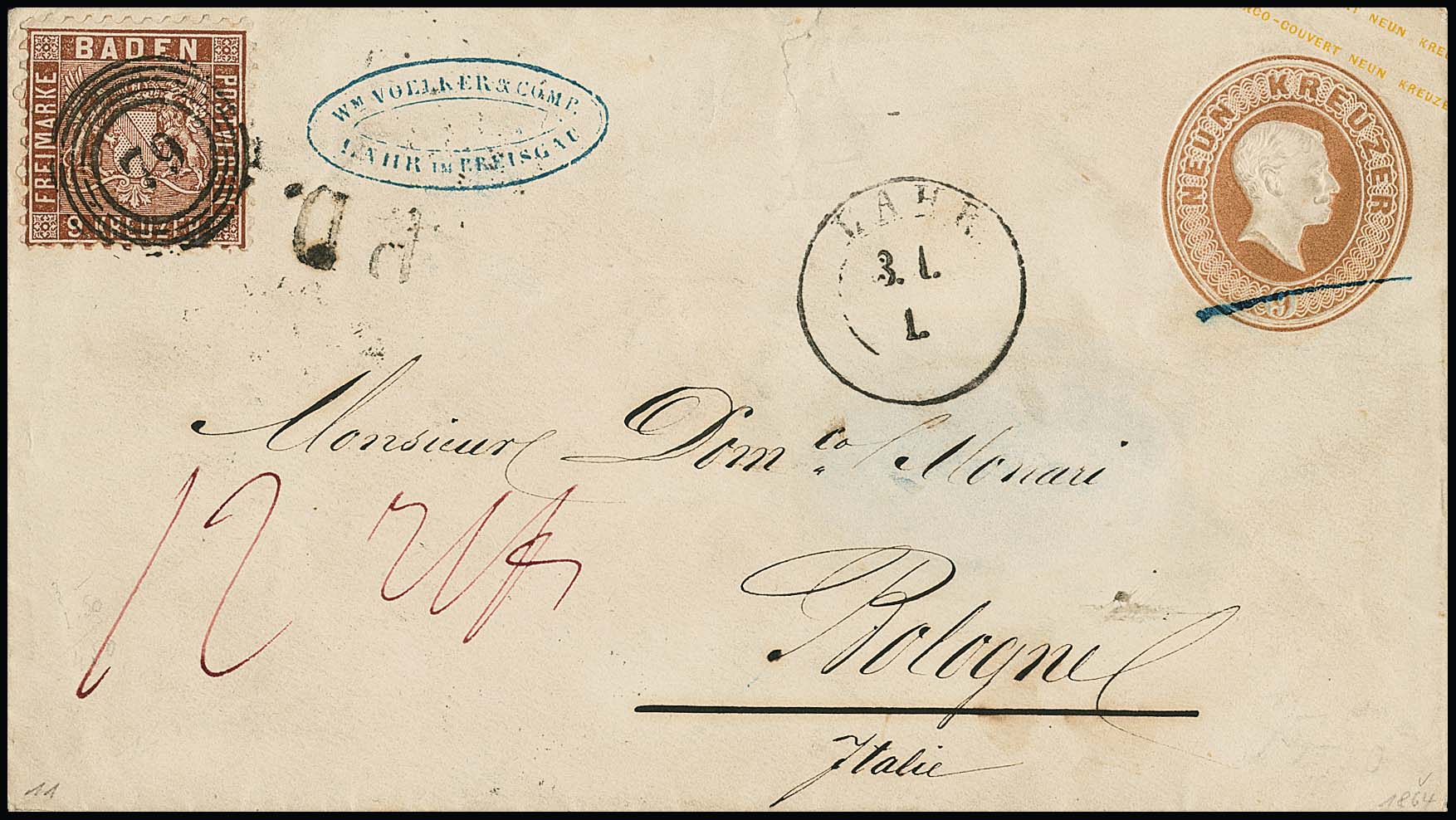 9 Kr. dunkelbraun (ein leicht verkürzter Zahn) als farb- und wertstufengleiche Zusatzfrankatur auf Ganzsachenumschlag 9 Kr. braun mit NS "79" und K2 "Lahr" nach Bologna/Italien (Umschlag rs. etwas unsauber geöffnet und Name des Adressaten überschrieben). Attest Brettl