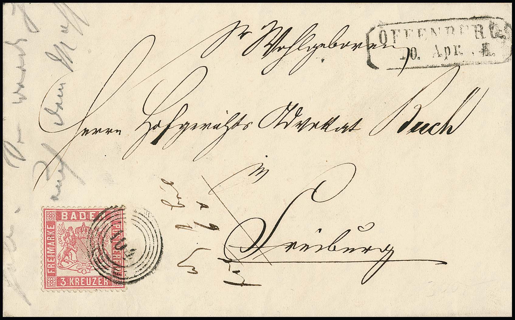 3 Kr. rosa, perfekt gezähntes Kabinettstück mit klarem NS "104" und Ra2 "Offenburg" auf Brief nach Freiburg. Mi. 500,-