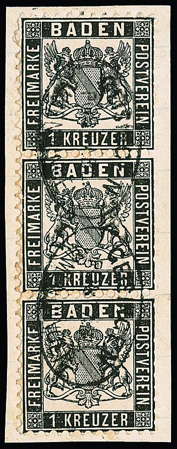 1 Kr. schwarz im senkrechten Dreierstreifen auf Briefstück mit Postablagestempel "Geisingen-Immendingen"