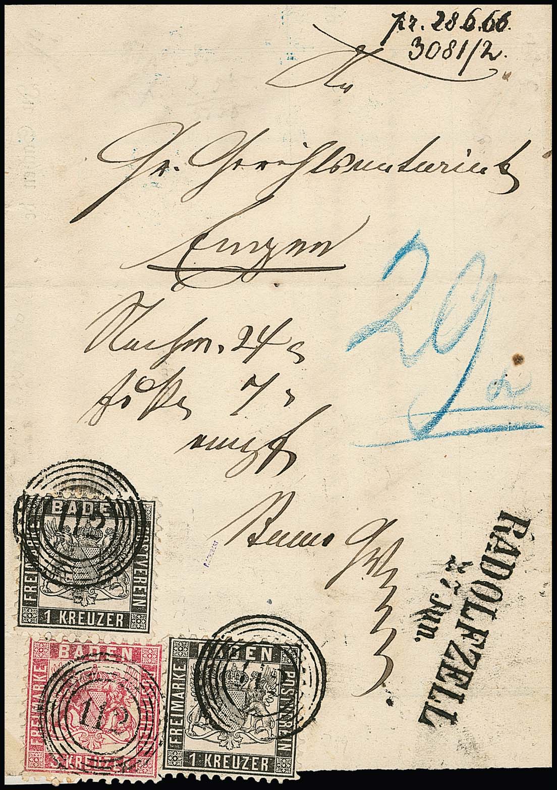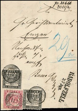 1 Kr. schwarz, zwei Exemplare (einmal ein verkürzter Zahn), nebst 3 Kr. rosa, auf senkrecht geschriebenem Nachnahmebrief mit NS "112" und L2 "Radolfzell", sign. Englert