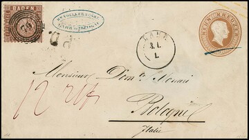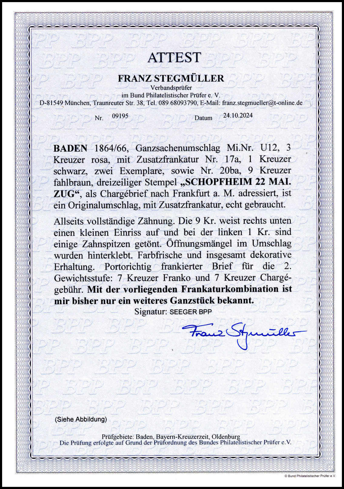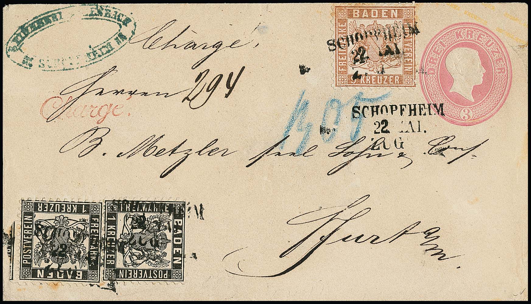 1 Kr. schwarz per zwei nebst 9 Kr. fahlbraun auf Ganzsache 3 Kr. rosa nach Frankfurt/M., seltene Entwertung durch Bahnpost-L3 "Schopfheim 22. Mai Zug" und nebenges. rotem L1 "Chargé". Frische und saubere Erhaltung mit einigen winz. verwendungsbed. Unebenheiten. Eine Frankatur-Seltenheit für einen Chargé-Brief in der 2. Gewichtsstufe, sign. Seeger, Fotoattest Stegmüller ("mit der vorliegenden Frankatur-Kombination ist mir bisher nur ein anderes Ganzstück bekannt")