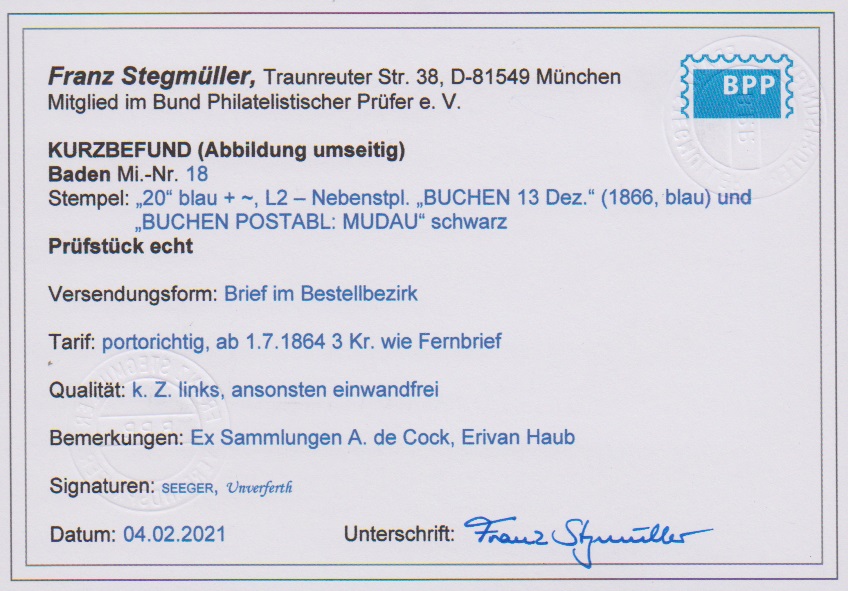 3 Kr. rosa (ein kurzer Zahn links) einzeln auf Brief mit blauem NS "20" und L2 "Buchen", sowie Postablage-Nebenstempel "Buchen-Mudau" aus dem eigenen Landbezirk nach Buchen, ex de Cock, Fotoexp. Stegmüller. Dazu gleicher blauer NS auf Fernbrief 3 Kr. sowie auf zwei Briefstücken 3 und 6 Kr., ex Slg. Erivan Haub