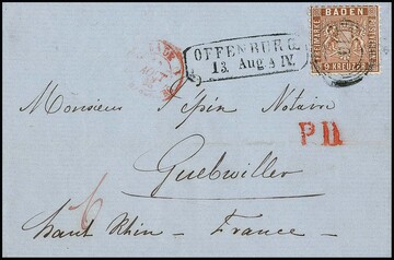 9 Kr. rotbraun auf Luxusbrief von Offenburg ins Elsaß mit Weiterfranko-Vermerk "6", sign. Stegmüller. Mi. 200,- +