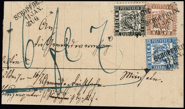 1 Kr. schwarz, 6 Kr. ultramarin (kleine Eckzahnaufspaltung) und 9 Kr. rötlichbraun, drei gut gezähnte Exemplare als ungewöhnliche Dreifarben-Frankatur auf Nachnahme-Teilbrief, entwertet durch Zug-L3 "Schopfheim"