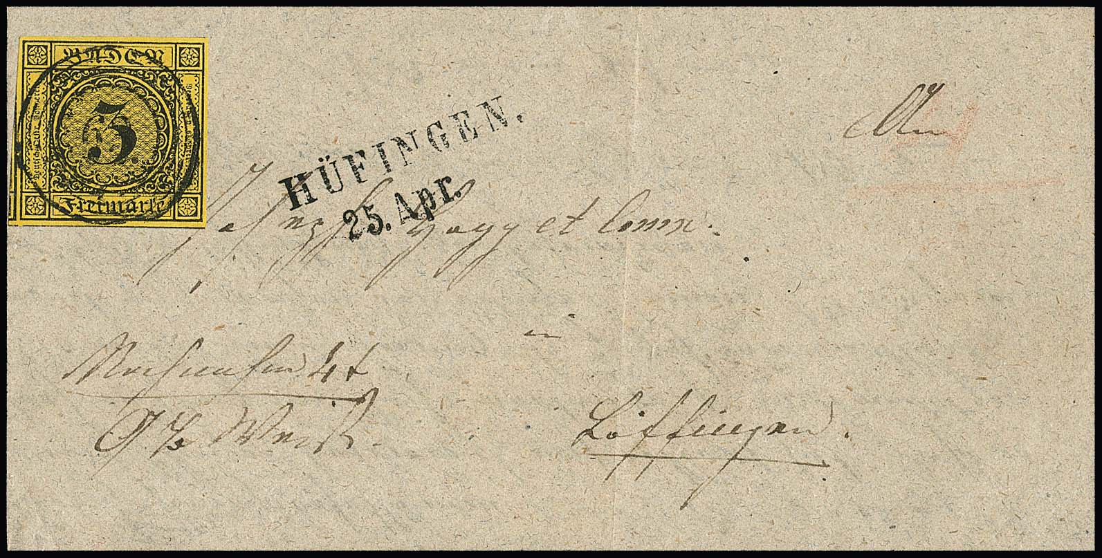 3 Kr. schw./dunkelgelb, riesenrandiges Luxusstück (drei Seiten Nebenmarken) auf Nachnahme-Faltbriefchen mit NS "63" und Neben-L2 "Hüfingen" 1852. Brief wie üblich ohne Seitenklappen, ex Slg. Erivan Haub