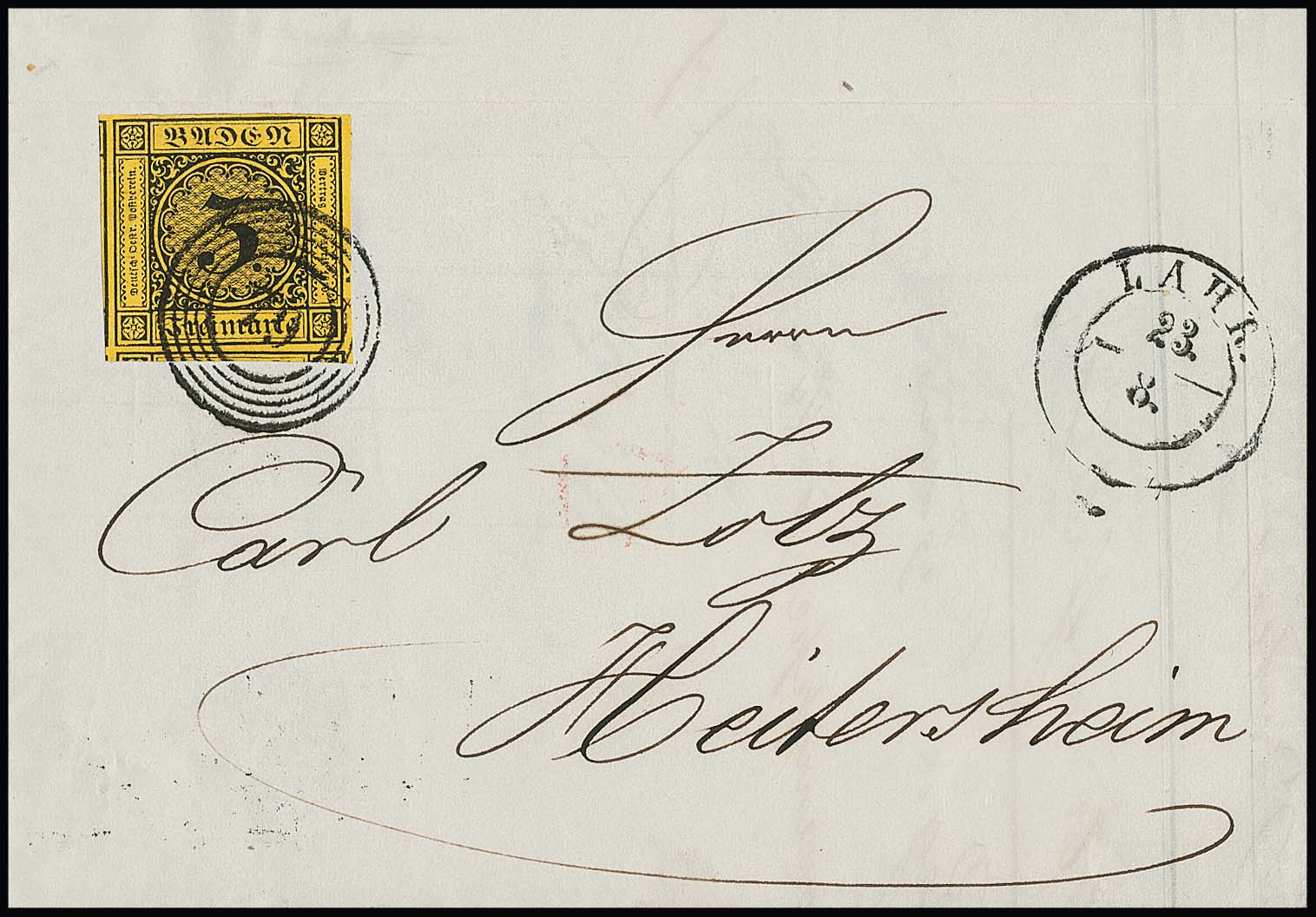 3 Kr. schw./dunkelgelb, riesenrandiges Luxusstück mit mehreren Nebenmarken auf gefaltetem Brief mit NS "79" und K2 "Lahr", ex Slg. Erivan Haub
