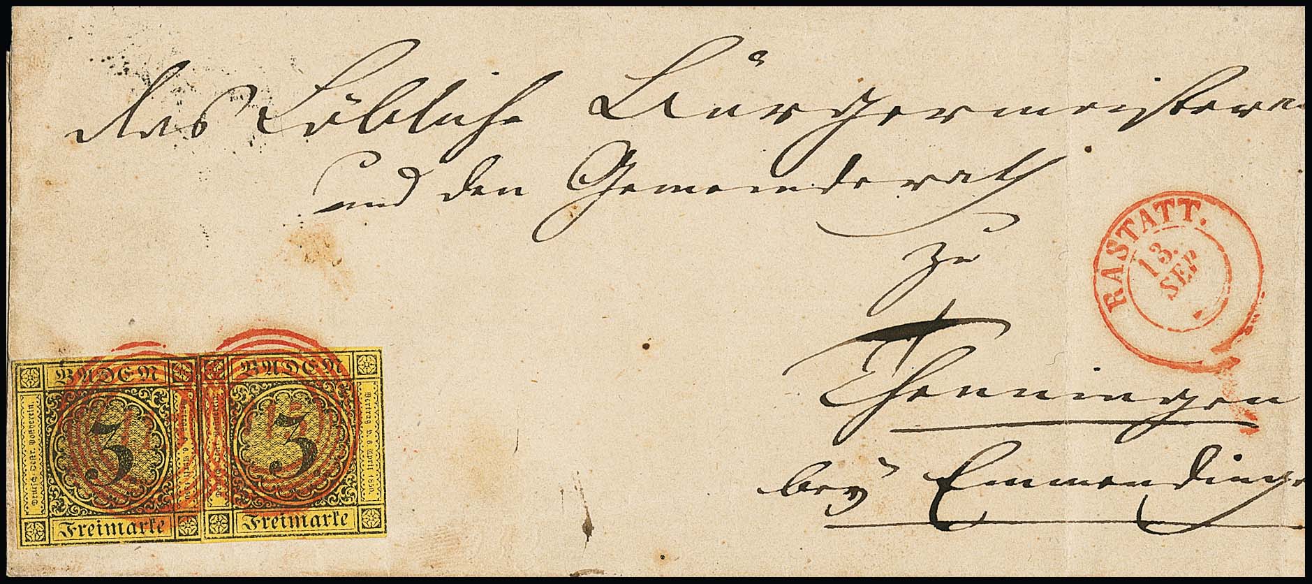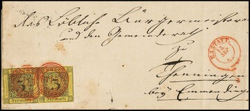 3 Kr. schw./gelb, zwei Prachtstücke auf (seitlich nicht ganz komplettem) gef. Brief mit je roten NS "115" und K2 "Rastatt", sign. Seeger