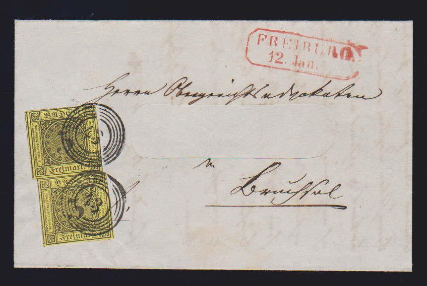 3 Kr. schw./gelb per zwei, unteres überrandiges Kabinettstück, auf Brief (Adressname ausgeschnitten) aus Freiburg (roter Neben-Ra2)