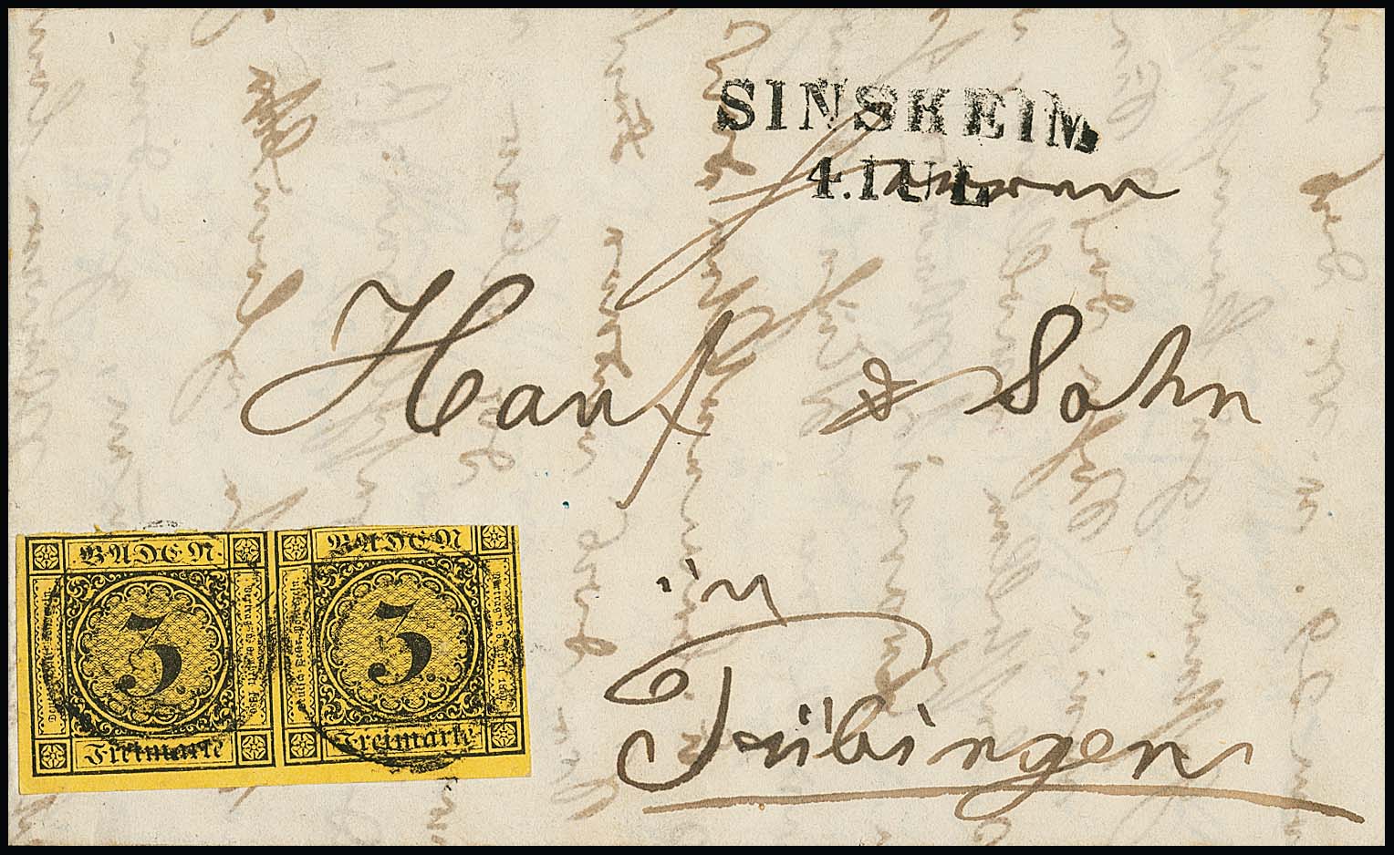 3 Kr. schw./dunkelgelb im Paar aus der linken unteren Bogenecke, natürliche Aufklebeknitter und rechte Marke oben angeschnitten, auf Brief von Sinsheim nach Tübingen