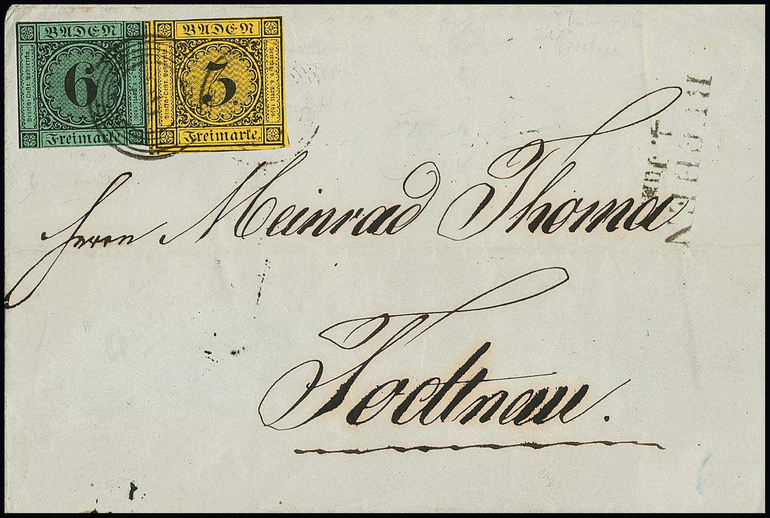 3 Kr. schw./dunkelgelb, teils überrandig, und ausgabetypisch geschnittene 6 Kr. schw./blaugrün auf Brief mit NS "20" und L2 "Buchen" nach Todtnau
