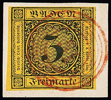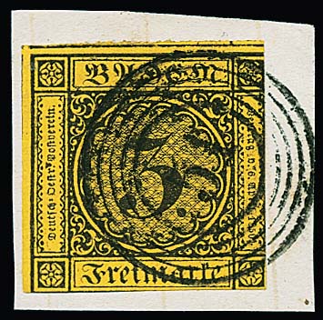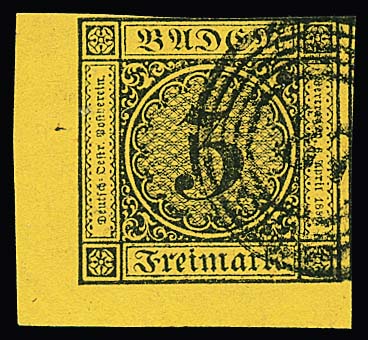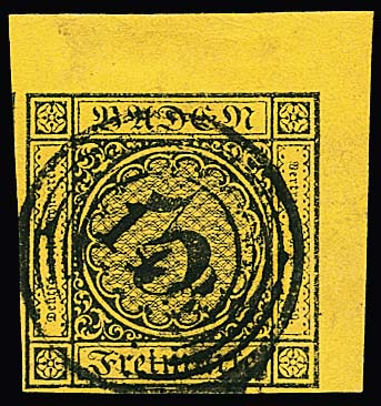 3 Kr. schw./gelb, größere rechte obere Kabinett-Bogenecke mit zentrischem und klarem NS "148" (Villingen), ex Slg. de Cock