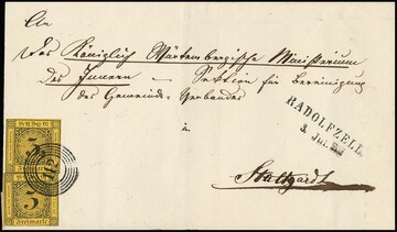 3 Kr. schw./dunkelgelb per zwei (obere vollrandig) auf schön adressiertem Prachtbrief von Radolfzell an das Innenministerium in Stuttgart