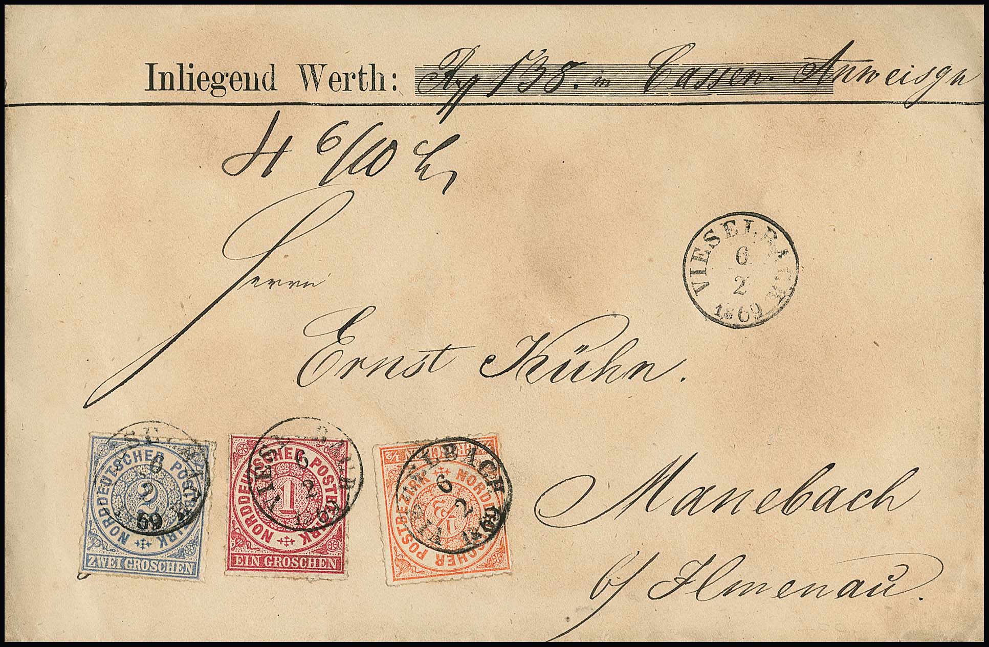 "Vieselbach", nachverw. Fingerhut-K1 auf Vordruck-Wertcouvert (leichte Siegeldurchschläge) mit NDP 1/2, 1 und 2 Gr. (in den Landbezirk von Ilmenau), sowie auf Brief 1 Gr. NDP (rs. seltener Postablage-K1 "Tannroda-Berka a.d. Ilm")