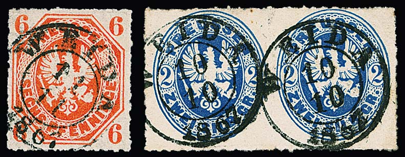 "Weida", nachverw. K2 auf Preußen 6 Pfge., 2 Sgr. (Paar) und 3 Sgr., ferner auf NDP 1/3 (Bfst.) und 2 Gr.