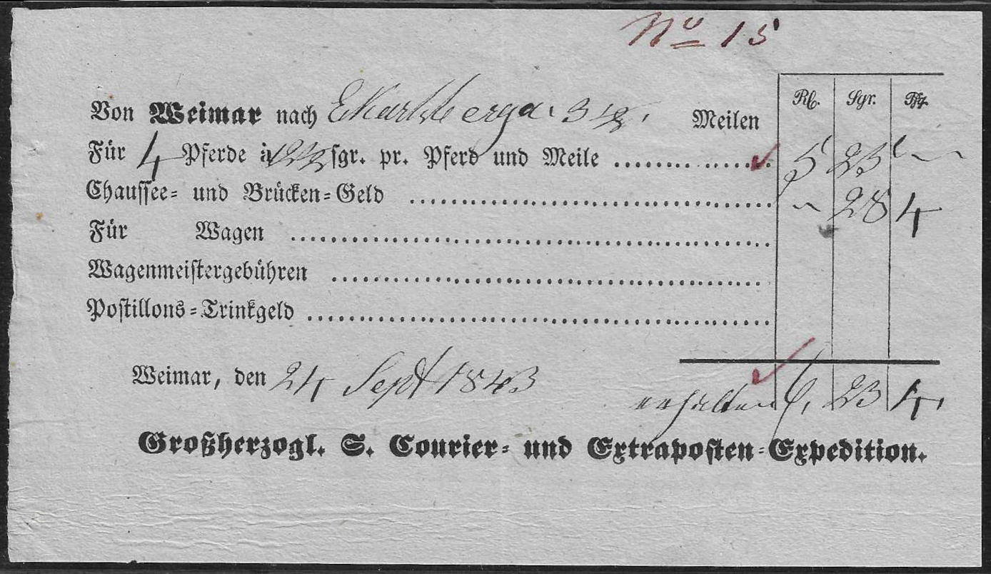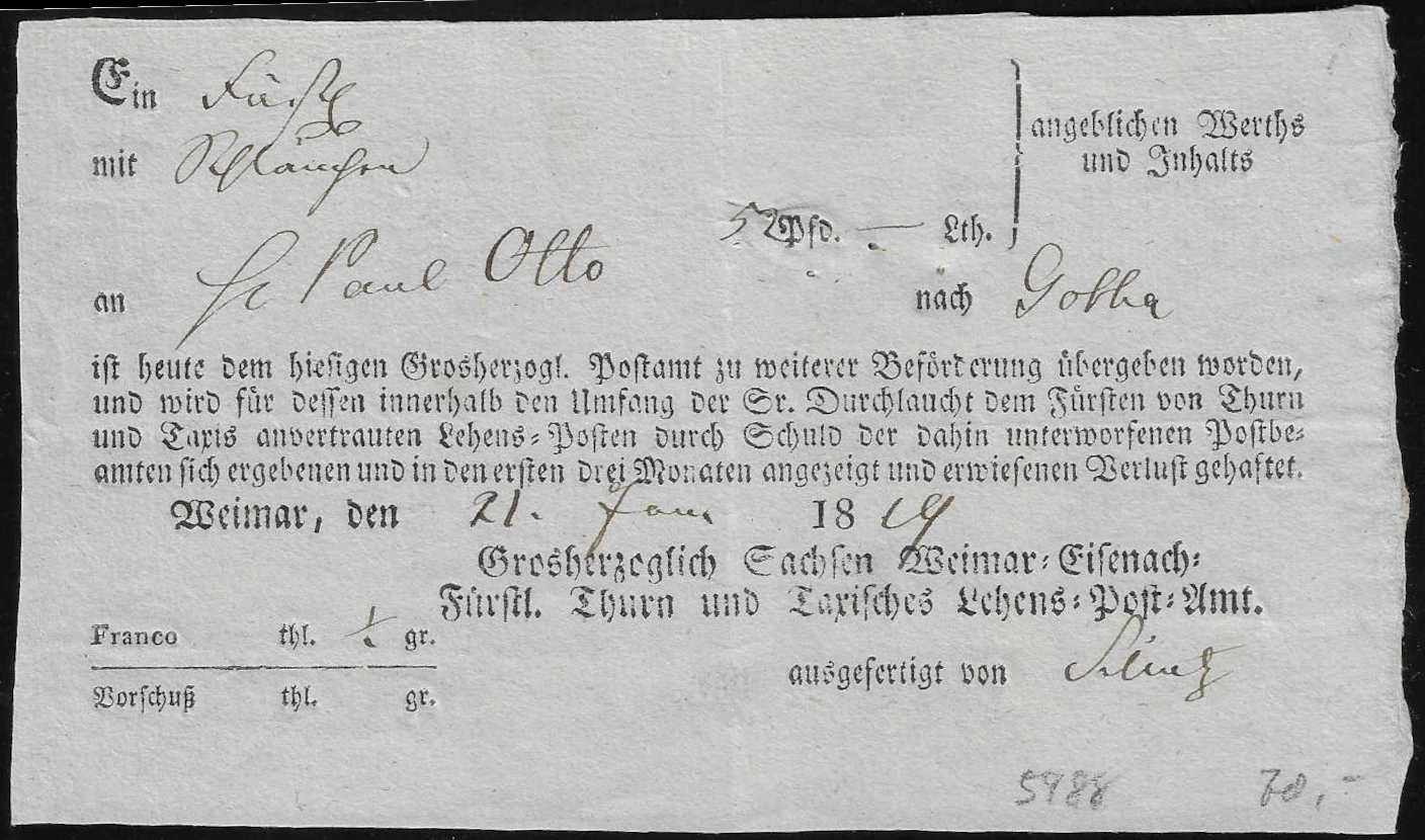 "Weimar", 1843, seltener Ortsdruck-Extrapostschein "Großherzogl. S. Courier- und Extraposten-Expedition", ferner Ortsdruck-Postschein 1824 des tax. Lehenspostamtes