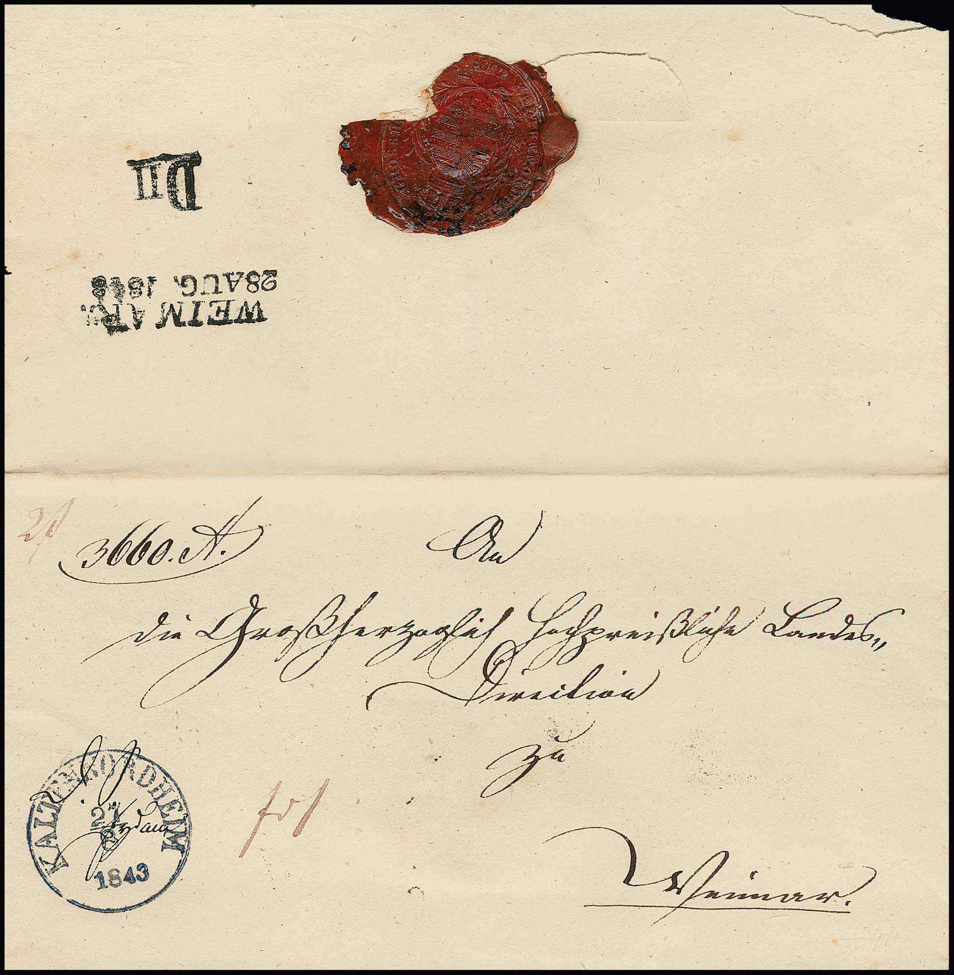 "Weimar", 1843, Brief von Kaltennordheim (K1) dorthin mit rs. sowohl Ankunfts-L2 als auch dem Distributionsstempel "DII", dies ist der einzig bekannte Brief von Weimar mit diesem Distributionsstempel!