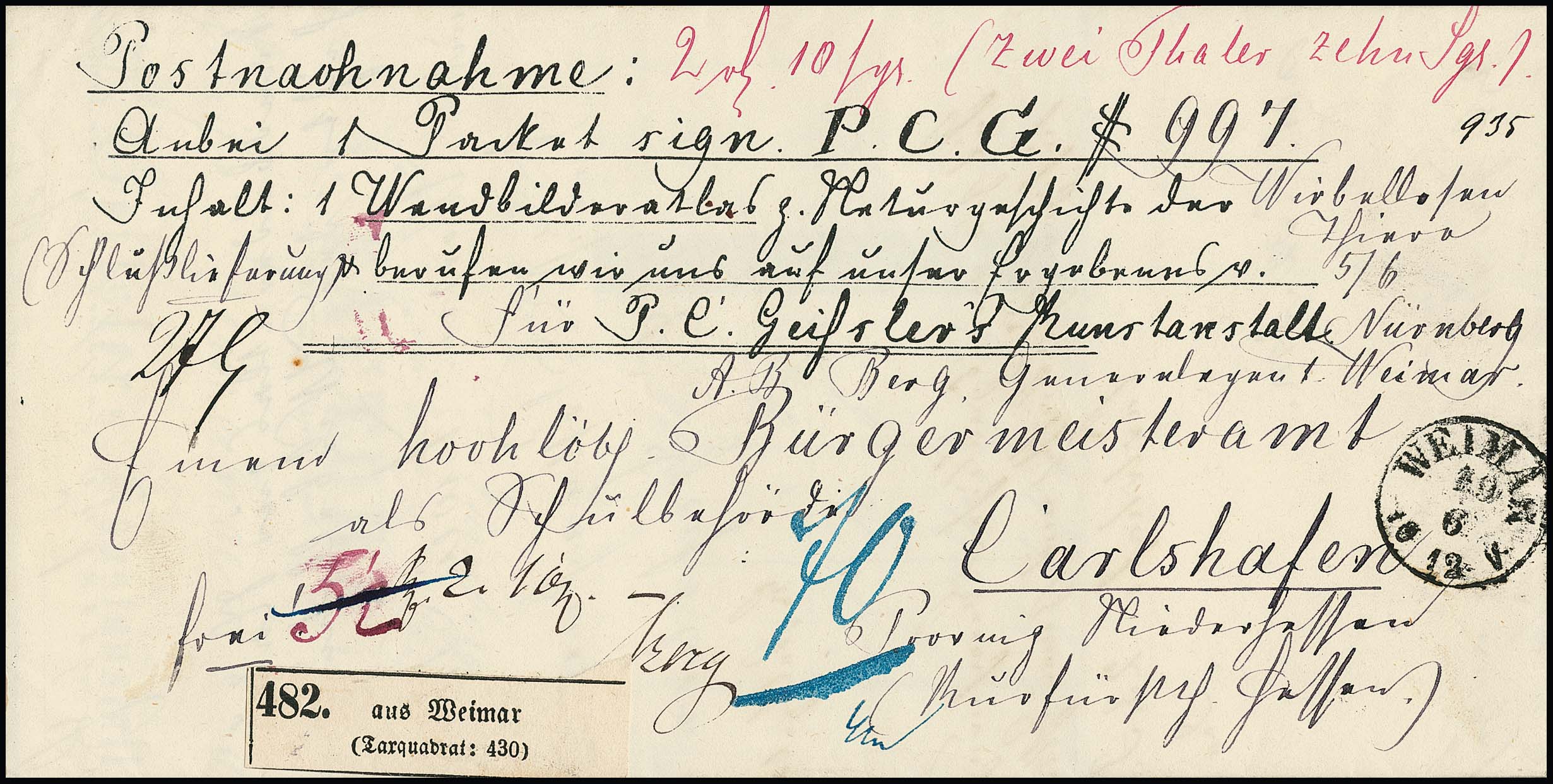 "Weimar", 1846, L2 auf dekor. Begleitbrief für drei Wert-Fässer nach Rudolstadt, sowie brauner K1 1850 auf Postvorschußbrief