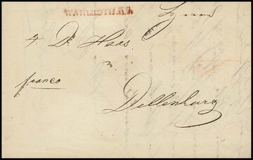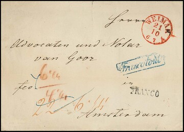 "Weimar", (1848), roter K1 auf Auslandsbrief (min. Randrißchen) nach Amsterdam mit div. Taxen